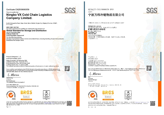 1月14日,万纬宁波北仑冷链园区(宁波万纬冷链物流有限公司)凭借卓越的食品安全管理水平,成功获得BRCGS S&D(全球贮藏和配送标准)最高级别 AA 级认证,标志着园区食品安全管理水平得到国际认可,获得了接轨国际市场的品质通行证。